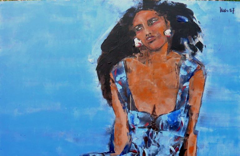 Her work is a journey between figurative and abstract, where the female figure and the landscape merge into a single emotional entity. Her landscapes show the strength of the earth, in her women paintings we see the strength of identity.